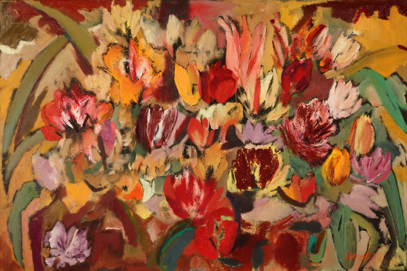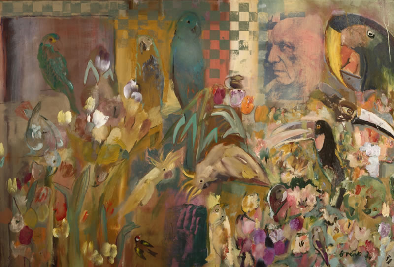 Parrots, Tulips, Picasso. Oil on canvas 180cm x 120cm.
